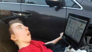For years, Soren struggled not just with speech but with communication. He taught himself to raise his arms for “yes,” sometimes blinking too. The school taught him to just blink, which was hard to interpret. For “no,” I tried teaching him to hum with his tongue behind his teeth, then pucker. He adapted this by puckering and sticking out his tongue. I can understand these cues, but others can’t.